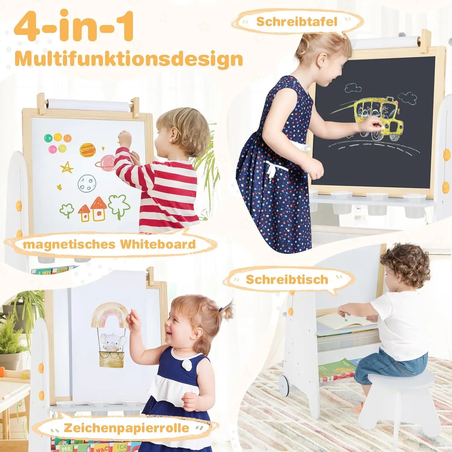 - 4-in-1 Funktion: Magnettafel + Kreidetafel + Papierrolle + Aktivitätstisch