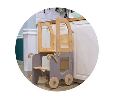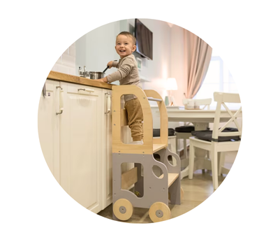 Der Lernturm ermöglicht es Kindern, aktiv am Alltag teilzunehmen – sicher, stabil und auf Augenhöhe.